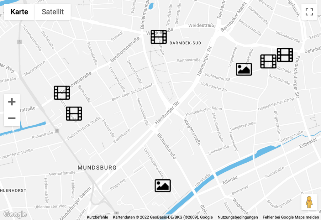 Wenn du hineinzoomst, erkennst du alle Orte und Dinge, die den Schülerinnen und Schülern auf ihrem Schulweg wichtig sind.